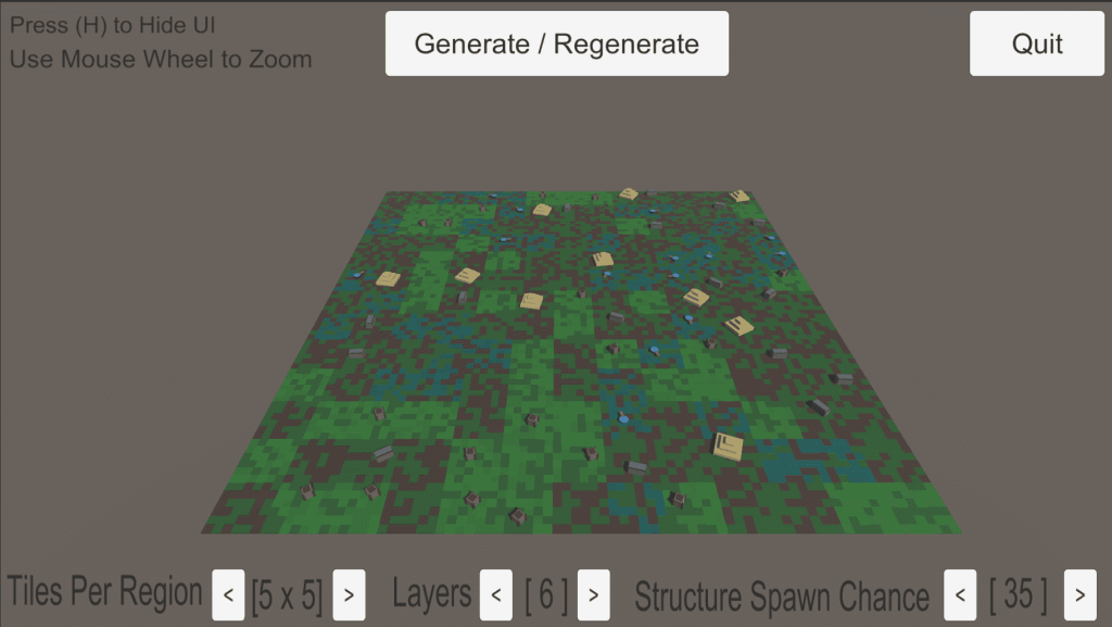 One of the most notable aspects of this generator is the user’s ability to tailor it to their preferences or game requirements. Parameters such as map size, the number of tiles per region, and the spawn probability for different structures can be adjusted. This level of customization ensures that each map generated can range widely in appearance and complexity, from densely packed urban landscapes with frequent structure spawnings to more sparse, nature-dominated settings where structures are rare.